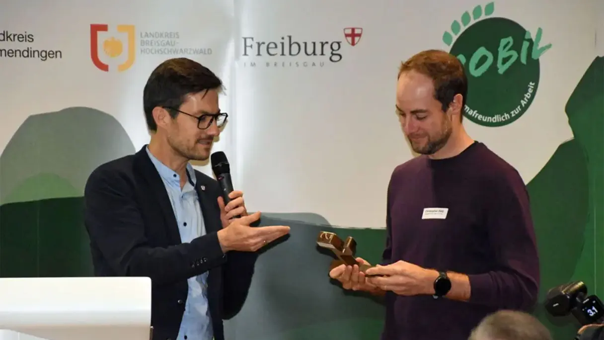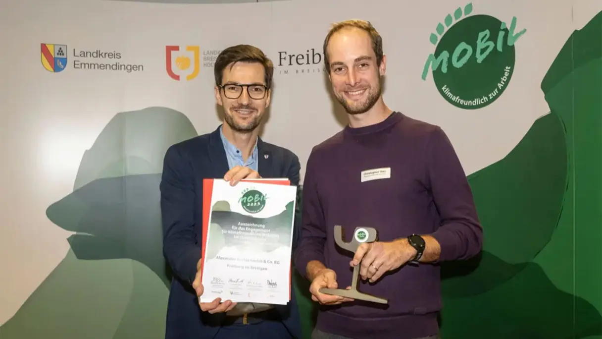 Für unseren Einsatz für klimafreundliche Mobilität wurden wir mit dem Mobil-Siegel ausgezeichnet. Das Mobil-Siegel wurde von der Freiburger Verkehrs AG (VAG) im Auftrag der Stadt Freiburg und in Kooperation mit den Landkreisen Emmendingen und Breisgau-Hochschwarzwald verliehen.